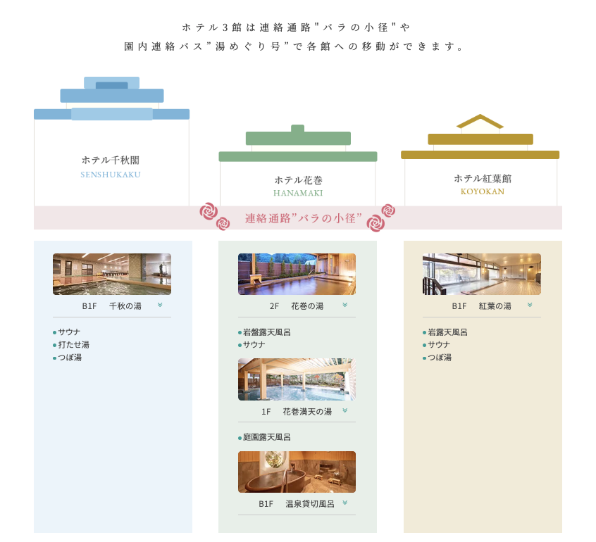 3つのホテルは連絡通路「バラの小径」で繋がっていて、食事はほぼ同様、大浴場はすべて共通で利用できますので、どのホテルに泊まるかはお部屋で決めてもいいと思います。