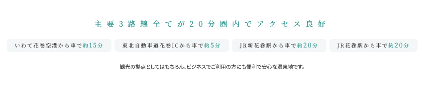 東北道、花巻ICから車で約5分、JR新花巻駅から車で約20分とアクセスも良好です。