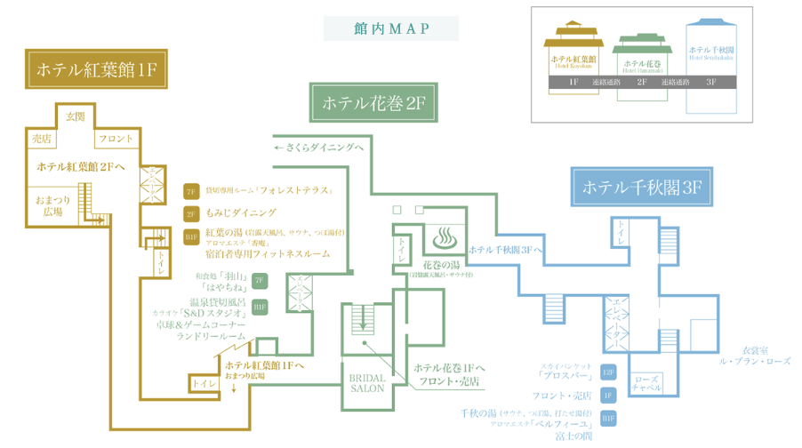 3棟あるホテルですが、一番奥にあるのがホテル紅葉館、中央がホテル花巻、入り口側にあるのがホテル千秋閣、全体では422室、東北最大級の巨大な温泉ホテルとなっています。