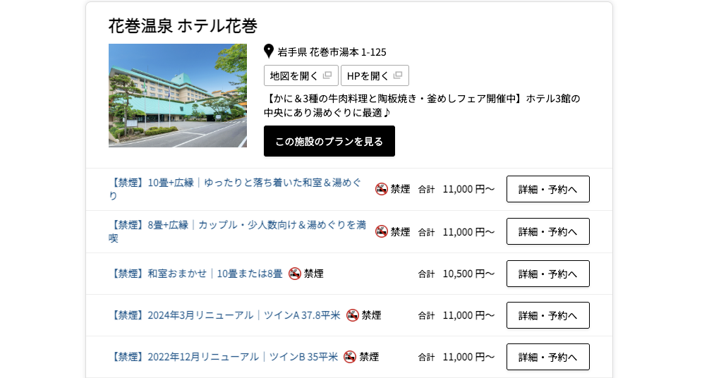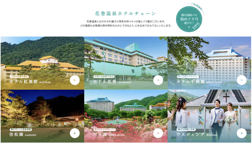 一方で、もう一つの花巻温泉は、「花巻温泉株式会社」が運営する、3つの大型ホテルと1つの高級旅館からなる、東北最大級の温泉ホテルグループ、「花巻温泉」です。