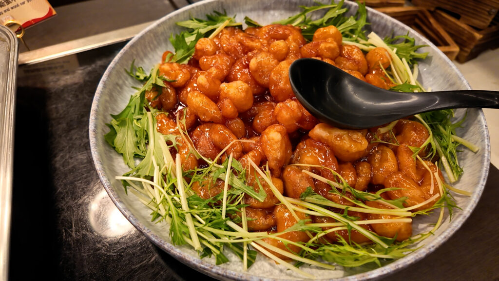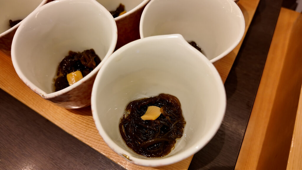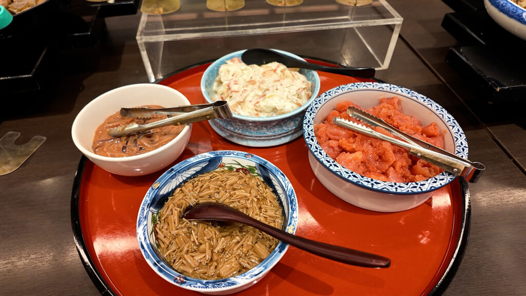 いか塩辛、なめ茸、海老サラダ、たらこ