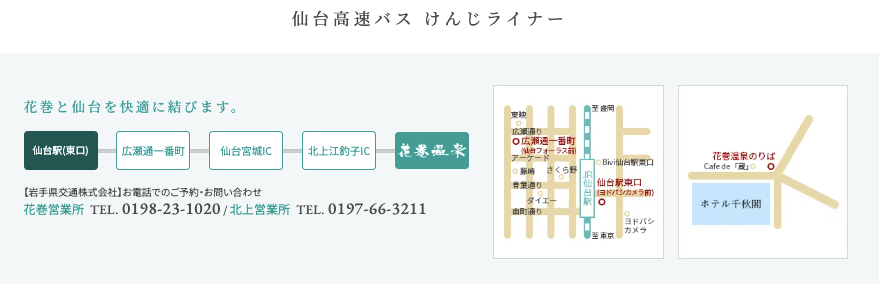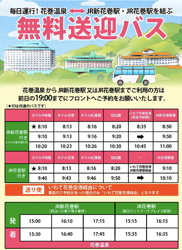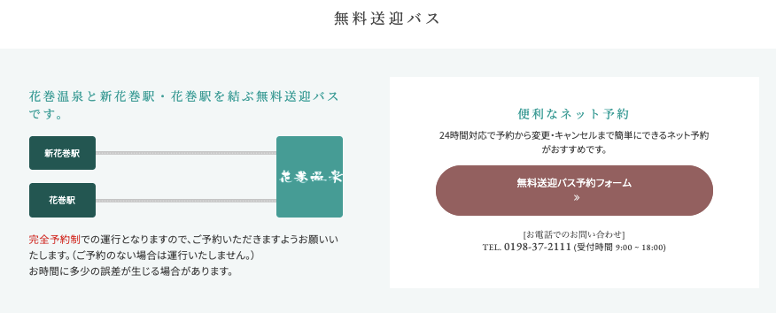 なお、花巻空港、JR花巻駅、新花巻駅、さらには仙台からの送迎バスも用意されています(いずれも要予約)。