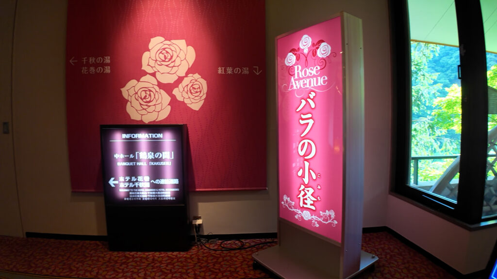 3つのホテルは連絡通路「バラの小径」で繋がっていて、食事はほぼ同様、大浴場はすべて共通で利用できますので、どのホテルに泊まるかはお部屋で決めてもいいと思います。