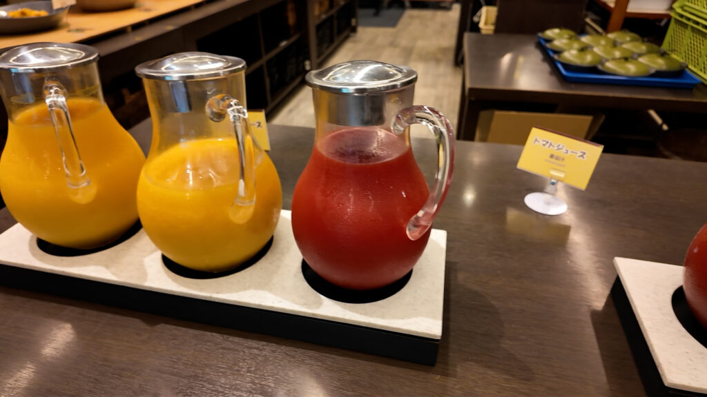 朝のドリンクは100%オレンジ、トマト、グレープジュース