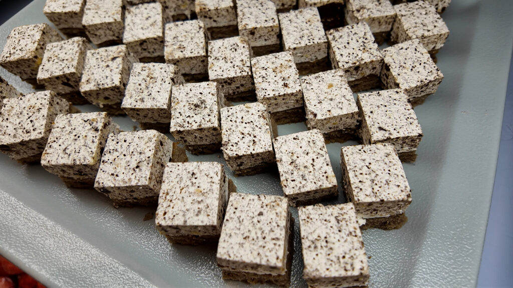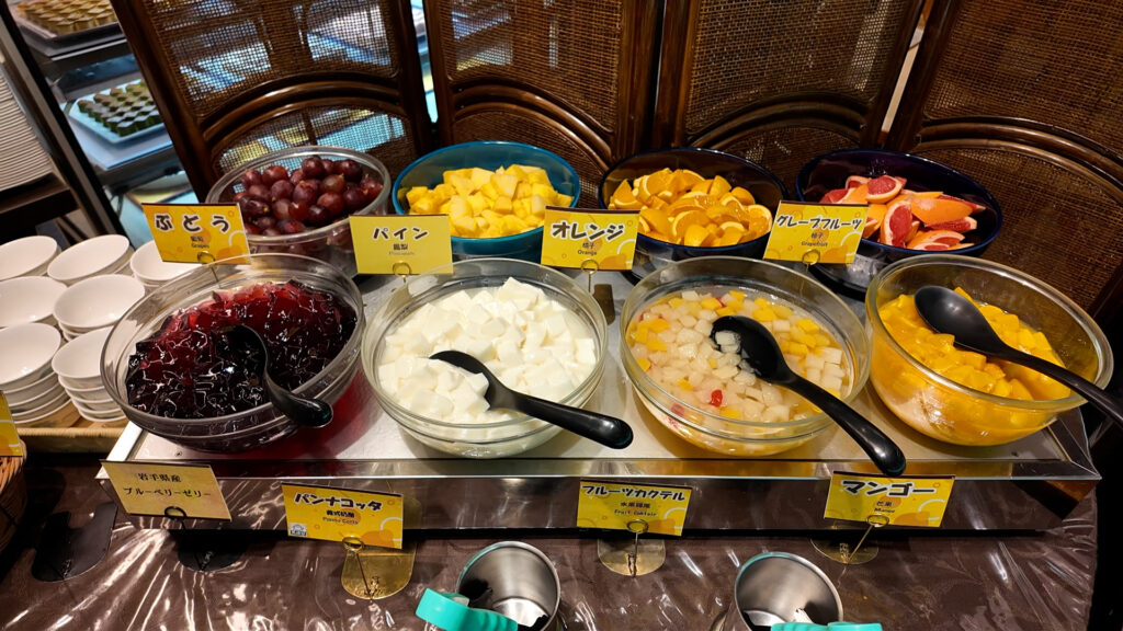 ブルーベリーゼリー、パンナコッタ、フルーツカクテル、マンゴー