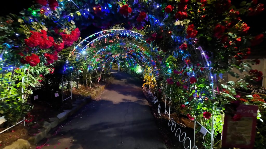 夜のバラ園はイルミネーションでライトアップされて彩りがさらに綺麗になっていました。
