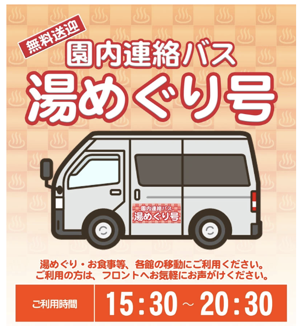 なお、ホテル間の移動には、園内連絡バスである湯めぐり号も運行していますので、こちらを利用するのもいいと思います。