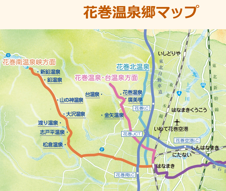 花巻温泉郷は、岩手県、花巻市の台川と豊沢川沿いを中心に、12の温泉(花巻温泉、台温泉、金矢温泉、松倉温泉、志戸平温泉、渡り温泉、大沢温泉、山の神温泉、鉛温泉、新鉛温泉、花巻北温泉、東和温泉)からなる温泉郷を形成しており、『花巻12湯』(はなまきじゅうにとう)と称されています。