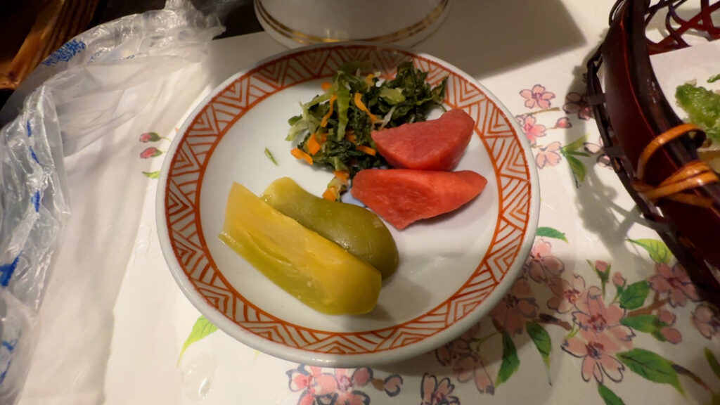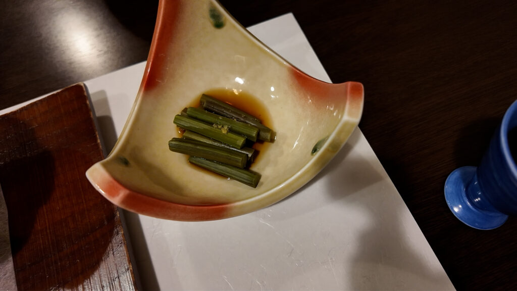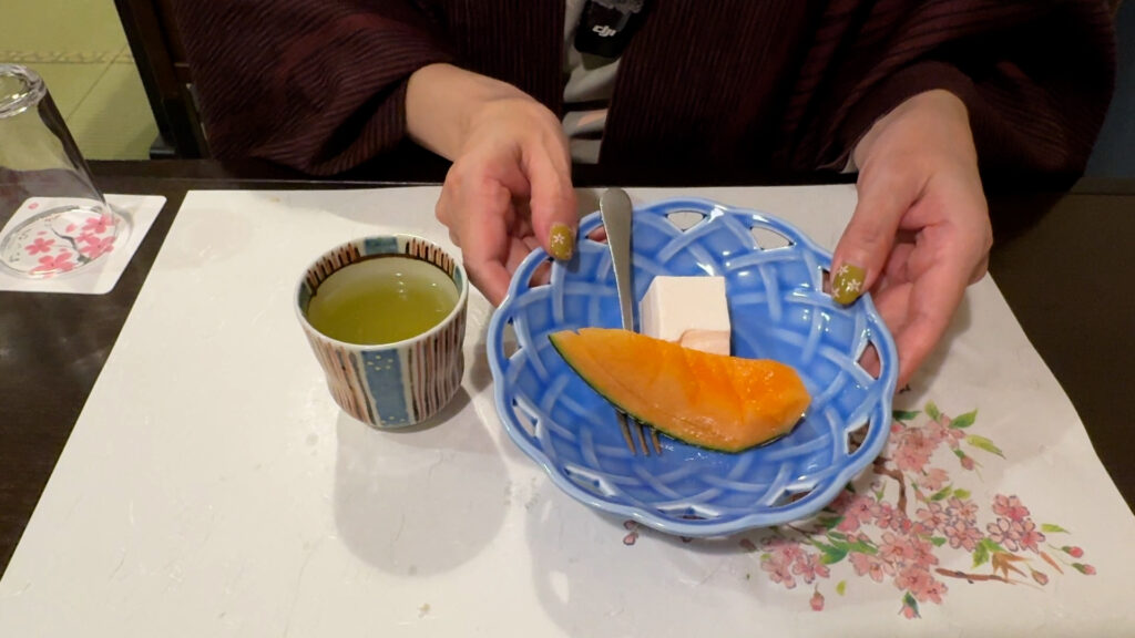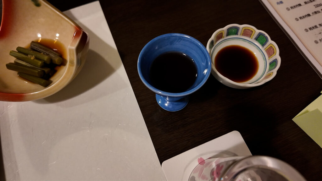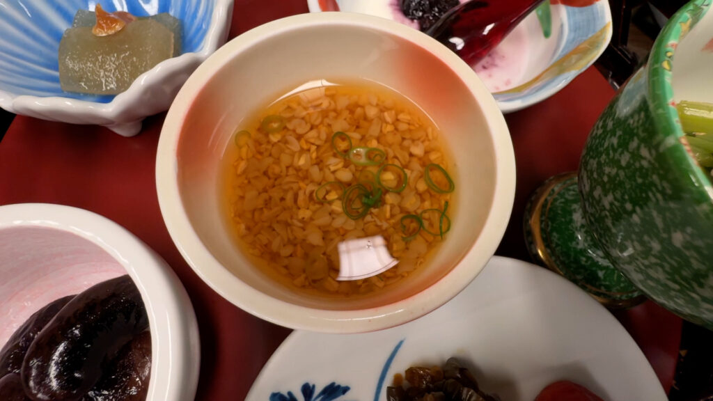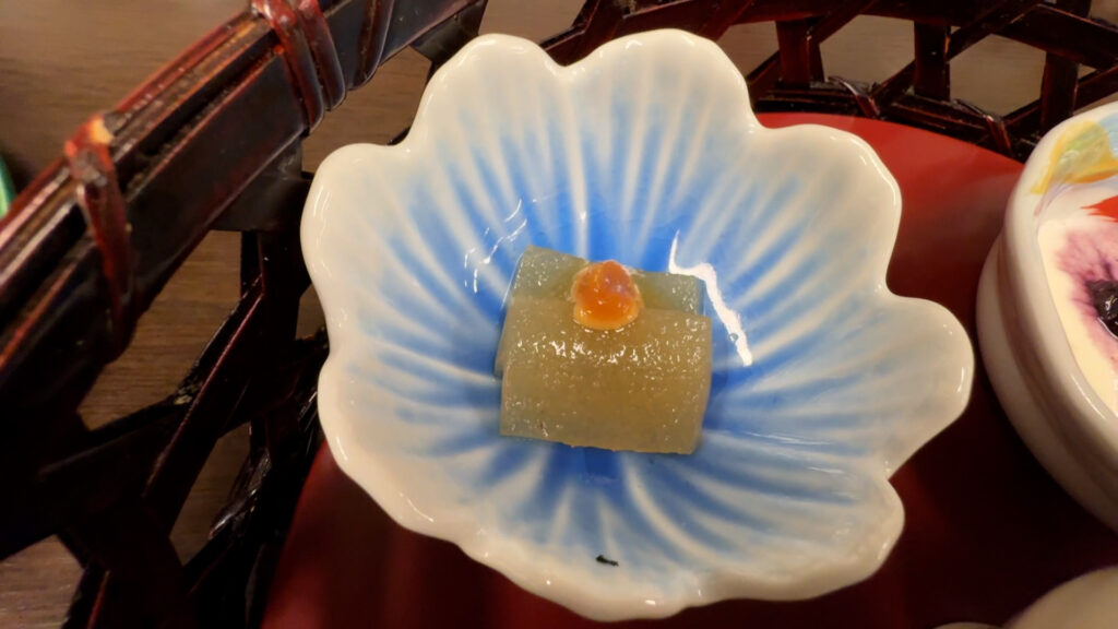 【酢の物】滝川豆腐 ところてんに豆腐を混ぜた、銀山温泉の伝統の料理。かき混ぜていただくそうです。