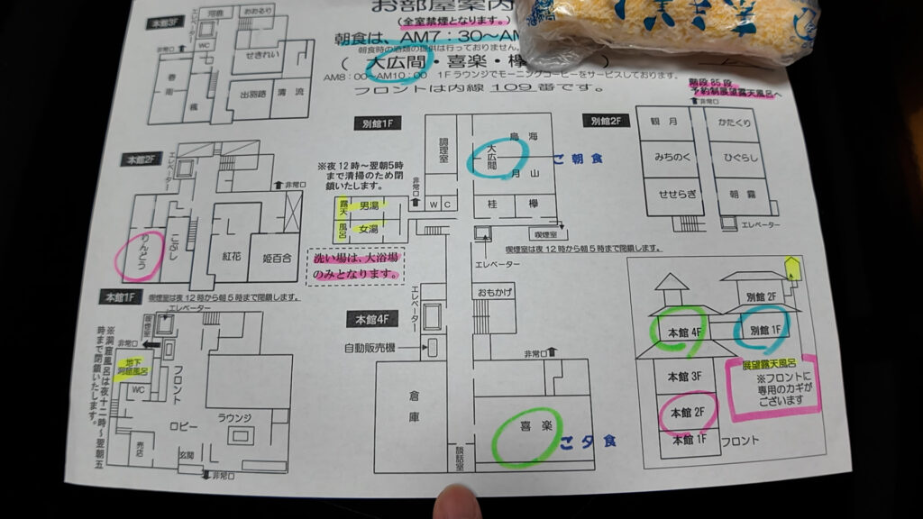 能登屋旅館には本館と別館があり、本館は川側で、別館は山側の棟となり、本館の4階が別館の1階と渡り廊下でつながっています。