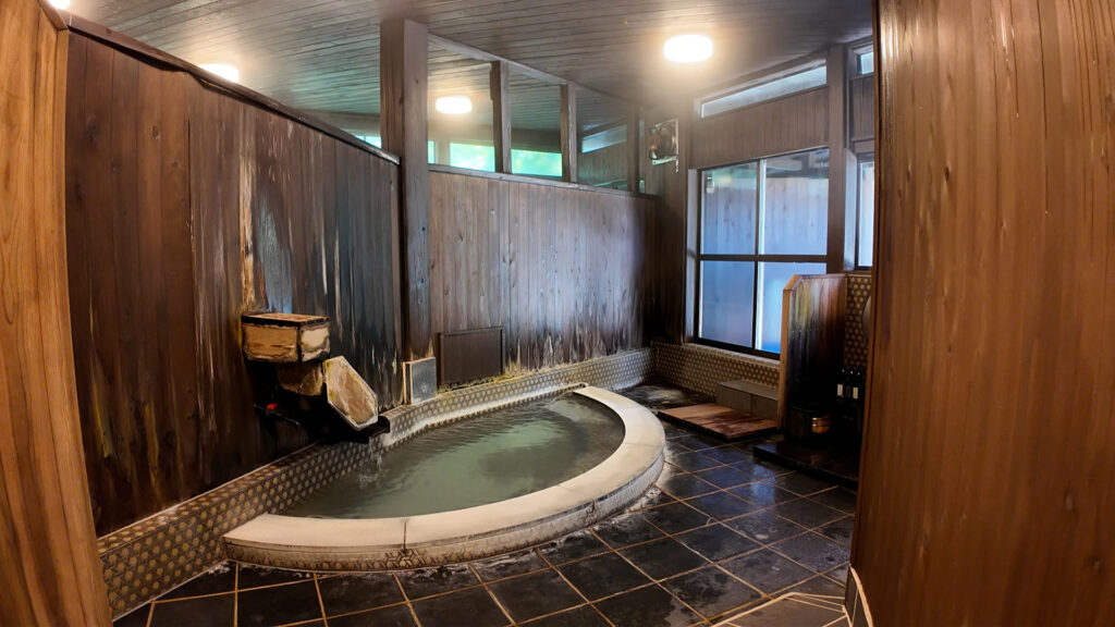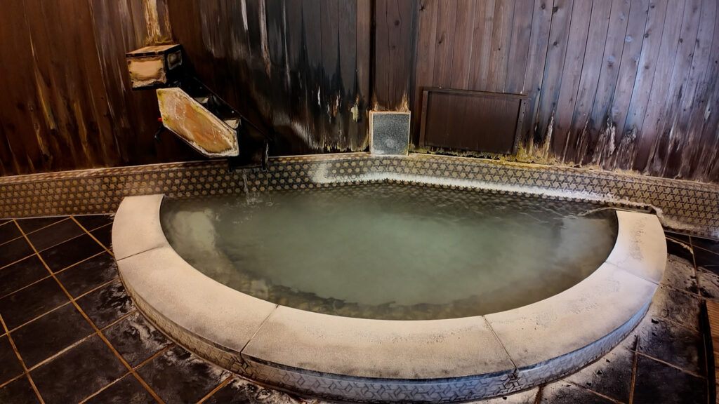 湯舟は小さめ、大人2-3人程度です。奥の木製の湯口からは源泉が100%で掛け流しになっています。