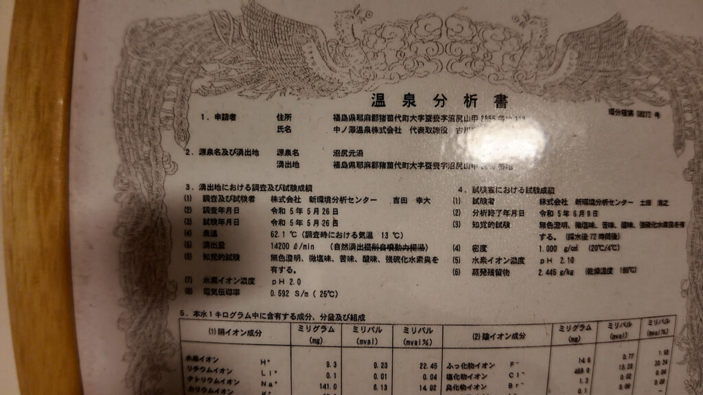 源泉名は沼尻元湯、pH2.0、含硫黄ーカルシウム・アルミニウムー硫酸塩・塩化物泉