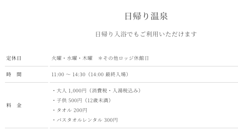 ロッジでは、日帰り入浴が可能です。料金は、大人1000円となっています。また、キャンプ場利用者は、時間帯によって無料で入浴が可能です。