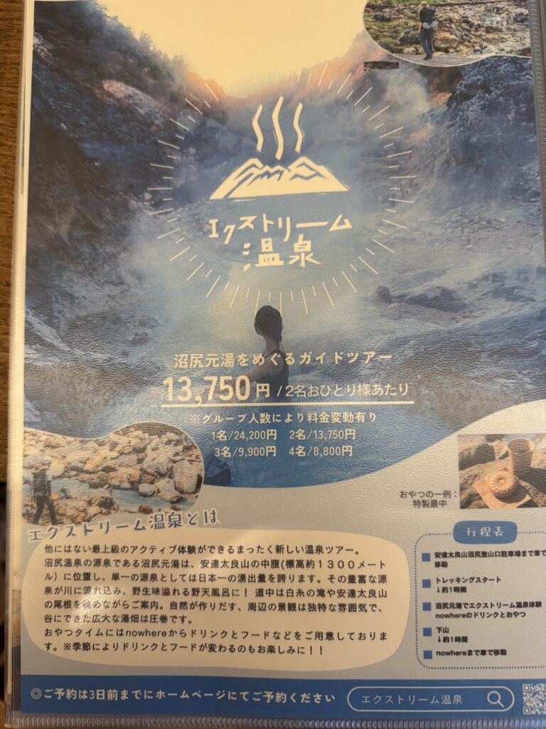 磐梯朝日国立公園内にある沼尻高原ロッジでは、周囲の豊かな自然を生かして、安達太良山ガイドツアーや、普段は立ち入ることができない沼尻源泉を巡るエクストリーム温泉プランなどのオプショナルツアーが用意されています。
