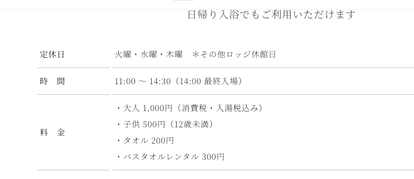 ロッジでは、日帰り入浴が可能です。料金は、大人1000円となっています。また、キャンプ場利用者は、時間帯によって無料で入浴が可能です。