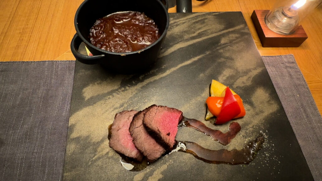 イチボ肉とは、お尻の先端部分にある、赤身と霜降りのバランスがとれた希少部位で、赤身の旨味と程よい脂の甘みが特徴です。薪火で薫香焼きにしたメインのお料理です。