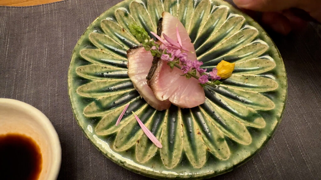 ヒラマサの藁いぶし。藁で炙って薫りをつけたお刺身です。